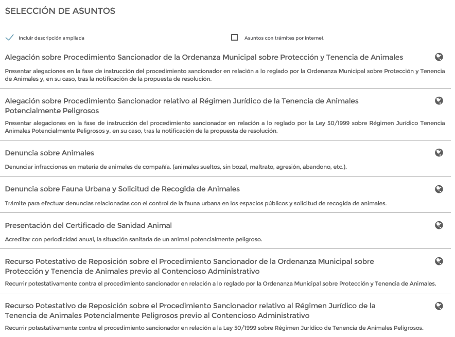 A continuación, si pulsamos en una subclasificación, se nos mostrarán, en la ventana de Selección de Asuntos, todos los trámites disponibles que tengan relación con la subclasificación seleccionada.
